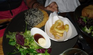 And then the cod and prawn burger arrived. In a black bun. Flavoured with squid. Sounds gross,  I know, but it was fabulous. My favourite.