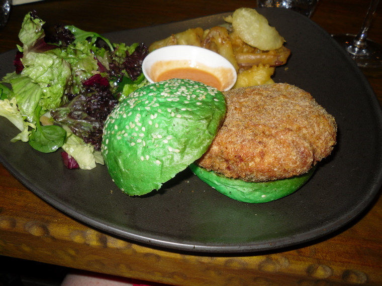 The veggie burger was made with red and green peppers, courgettes and onions and was by far the tastiest I’ve ever tried, particularly when dipped in the romesco sauce. That vivid green came from adding thyme to the dough, in case you were wondering, and although it made the bun look a bit like a scourer, it did give a wonderful flavour and smell.