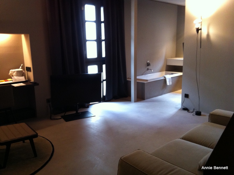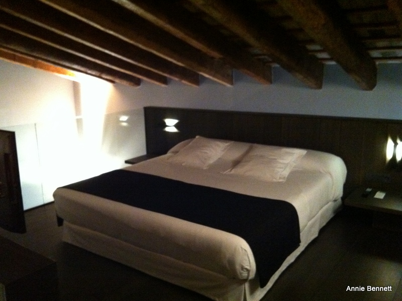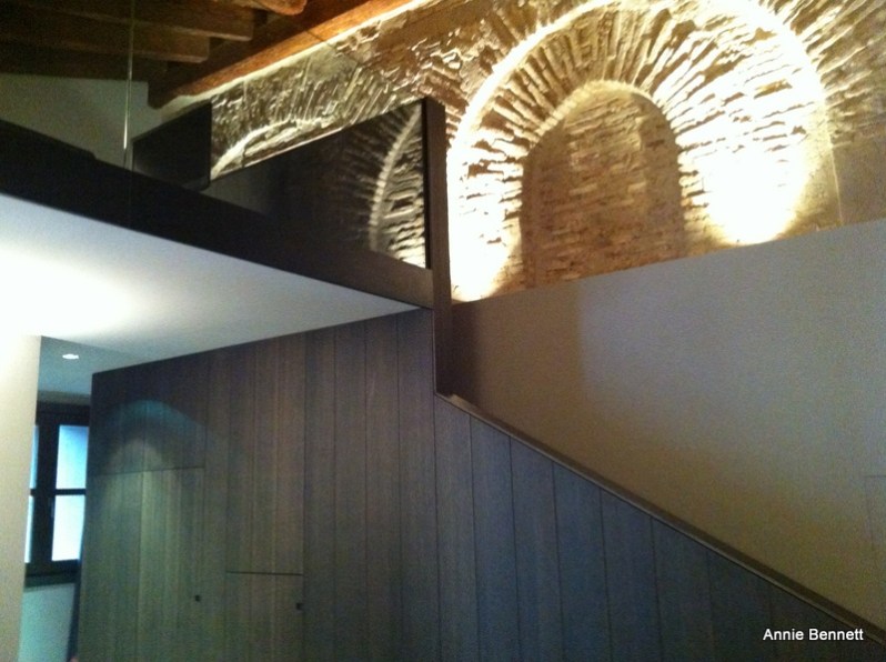 One of the hotels I’ve stayed in this week is the Caro in Valencia. I was in room 15, one wall of which is a vestige of a 12th-century tower that was part of the Moorish wall which surrounded Valencia. There is even a discreet plaque explaining what it is. But there isn’t anything remotely museumy about the room, which is vast, with the bed on a mezzanine level under a pitched ceiling with 19th-century beams.