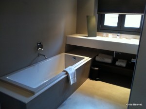 The bathroom is open plan – well, the bath and washbasins are part of the main space; the loo has a door and the shower is only visible if you’re lying in the bath. Toiletries are by Bulgari – shampoo, shower gel and body lotion – with a nice citrussy scent, and there’s a salon-style hairdryer. Francesc Rifé, a renowned designer from Barcelona, has gone for neutral tones for just about everything, with all the emphasis on the original features.