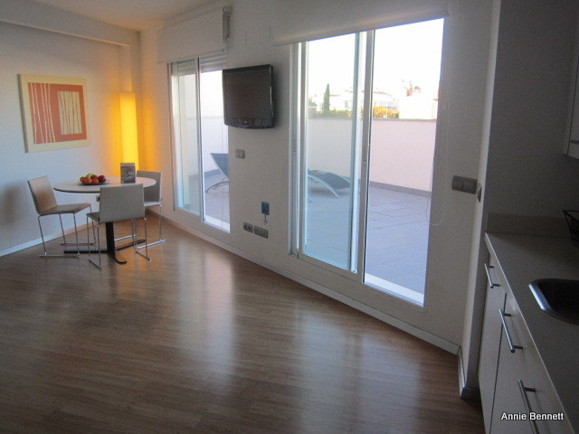 I stayed in Ático 503, on the fifth floor. It has a good-size living room with a kitchen down one wall – pretty well-equipped and with a dishwasher. Décor is white and neutrals, unfussy, with parquet floors and contemporary artworks.The big shock was when the blinds went up to reveal a vast terrace – with loungers, table and chairs – with a panoramic view across the city. You could have a great party out there.