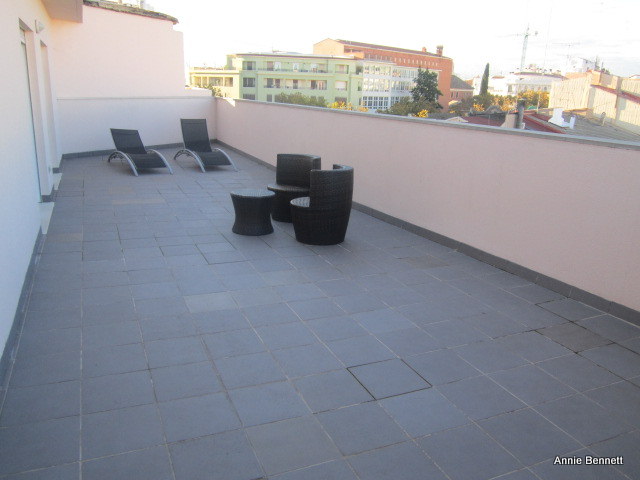 Upstairs on the sixth floor, there’s an even bigger terrace for everyone to use, where people from the different apartments get chatting. There’s also a very handy laundry room – well, cupboard – with a washing machine and dryer, which was an absolute godsend to me.