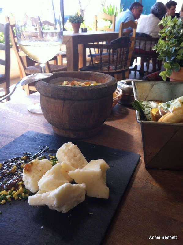payoyo and ajoblancoThe young, attractive waiting staff were really friendly and welcoming and great at explaining dishes and advising on how much to order. I saw they had payoyo – a hard, crystally artisan cheese made from sheep’s and goat’s milk in the Sierra de Grazalema in Cádiz – which I love, so I had to order that. I got half a dozen very chunky chunks for €3.90, which was amazing value. Most things are available as a tapa or a plato, with prices from around €3 to €10.  There’s an interesting wine list too; I had a couple of glasses of Fenomenal Rueda (€2.90). I ordered ajoblanco (€3.20), the great Malaga version of gazpacho, made from almonds, garlic, bread and olive oil, which came in a big wooden bowl and was silkily exquisite.