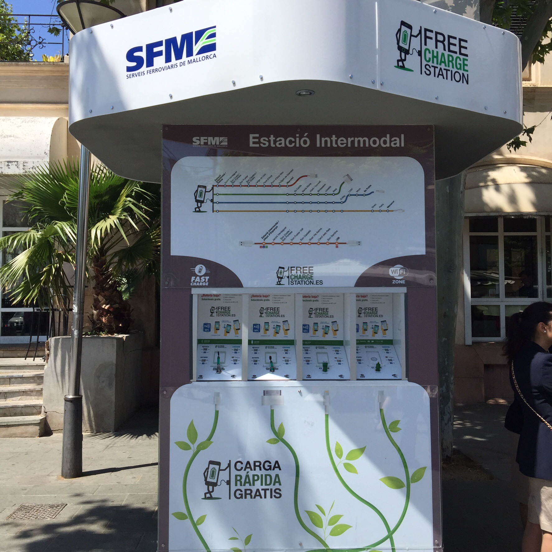 Posted on May 18, 2015May 18, 2015 by Annie Bennett Very handy! Mobile charging station in Palma On my way to the train station in Plaza de España in Palma a couple of weeks ago, I saw this thing outside the entrance where you can charge your devices. Very handy for travellers and fast and free too. Hope they catch on! Share this: Click to share on X (Opens in new window) X Click to share on Facebook (Opens in new window) Facebook Click to email a link to a friend (Opens in new window) Email Click to share on Pinterest (Opens in new window) Pinterest Like Loading...